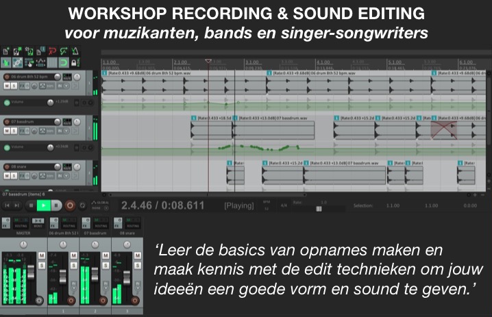 Ben je singer-songwriter en neem je graag je eigen songs op? Dan is deze workshop ook uitermate geschikt voor je om te zorgen dat je snel je opname apparatuur goed hebt ingesteld en je jezelf goed kan foccusen op je performance en dan achteraf met de juiste edit tools je ideeën goed in de balans te zetten en eventueel nog wat kleine verbeteringen aan kunt brengen.
