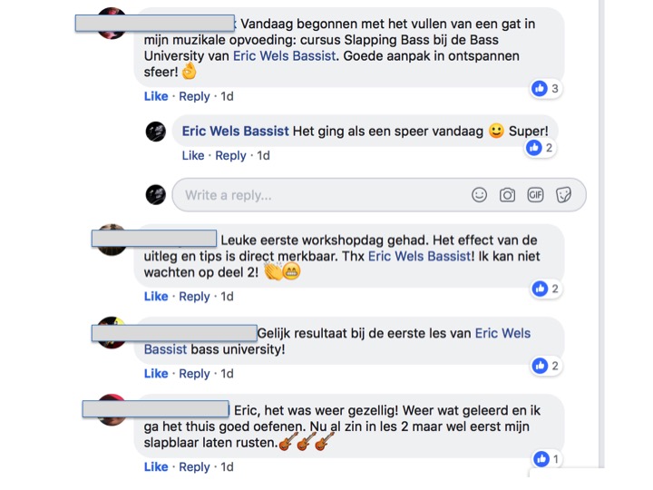 In de opvolgende weken checken we steeds jouw eigen techniekvorderingen, doen we wat snelheids oefeningen en gaan we dan in op allerlei slap-pull combinaties, en omdat we al veel verschillende combinaties hebben geoefend, gaan we ook bekende slap bass patronen wat nader bekijken en doornemen. Denk daarbij aan wat Larry Graham, Mark King, en Flea baslijnen. En dat is enorm fun(k)! Je gaat dus door de workshop heen op je eigen tempo. Je bent niet afhankelijk van de niveau's van anderen. Je haalt er uit wat er voor jou inzit.